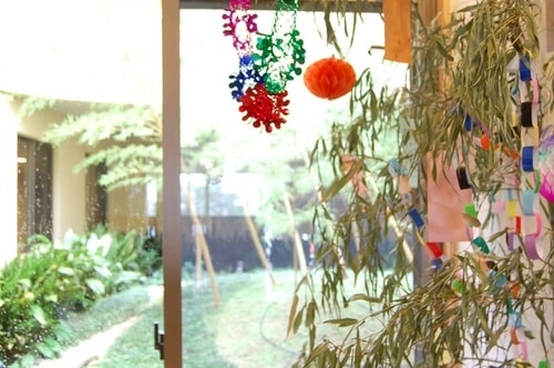 大巌寺よりいただいた笹で各所飾りつけをし、また入居者・利用者の皆様や職員の願い思い思いに書いて短冊を吊るしました。