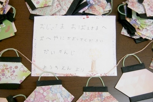 小さな手で一生懸命折っているところが目に浮かぶようで、「かわいいねぇ」と目を細めて眺めている方もいました。
