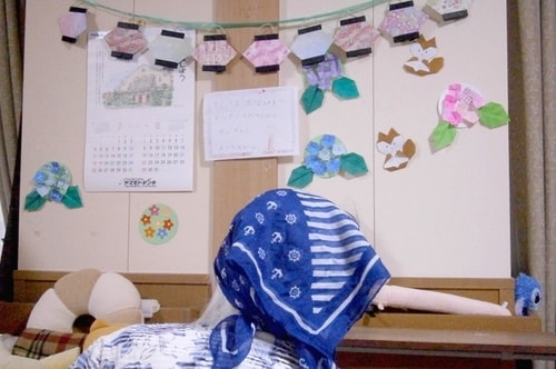 たくさんいただいたので、紐でつなげて壁にかざったり、色々なところに飾らせていただきました。