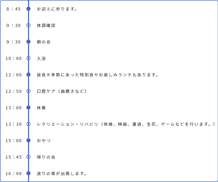 ご家族以外の方と交流し、のんびり、ゆっくり、気ままに1日を楽しく過ごしていただく日帰りのサービスです。ご入浴やお食事など日常生活を支援しながら、機能訓練、レクリエーションなどのサービスを提供いたします。